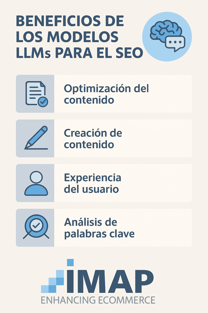 Dada la amplia gama de ventajas descritas, ¿cómo puede una agencia aprovechar al máximo un modelo LLMS para sus clientes? Una agencia de marketing digital como IMAP está en una posición ideal para integrar la IA generativa en sus servicios y así ayudar a los clientes a escalar sus resultados en buscadores de forma eficiente. A continuación, algunas formas en que IMAP (y agencias similares) pueden incorporar los modelos de lenguaje en su día a día: