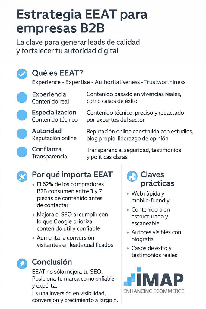 En resumen, trabajar una estrategia EEAT robusta no es sólo una tarea de SEO o branding, sino una inversión directa en el rendimiento comercial. Más allá de posicionar mejor en Google, estarás posicionando tu marca en la mente del comprador como un proveedor confiable y experto. Los leads generados bajo esta premisa tienden a estar más informados y a confiar más en tu propuesta, lo que puede acortar ciclos de venta y aumentar las tasas de cierre.