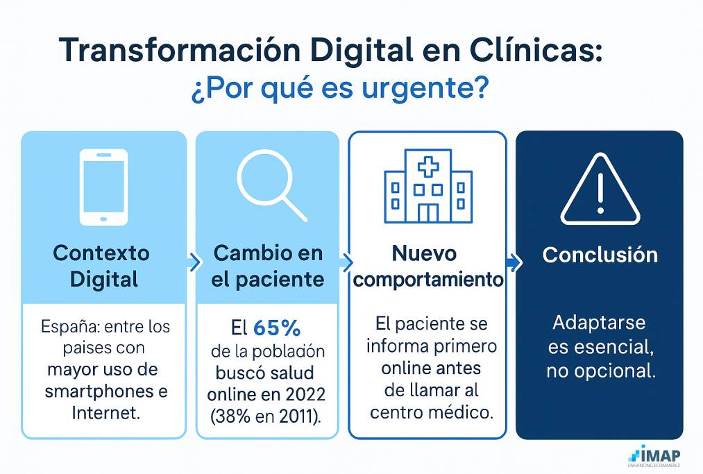 Para comprender la urgencia de la transformación digital en clínicas, conviene enmarcar el contexto digital en el sector salud español. España es uno de los países con mayor penetración de smartphones y uso de internet en Europa, y la salud no es ajena a esta realidad. Según datos de Eurostat, el 65% de la población española buscó información de salud en Internet en 2022, un salto notable desde el 38% registrado en 2011. Esta tendencia al alza indica que los hábitos de los pacientes han cambiado: antes de llamar a un centro médico, la mayoría se informa en la red sobre síntomas, tratamientos o especialistas recomendados.